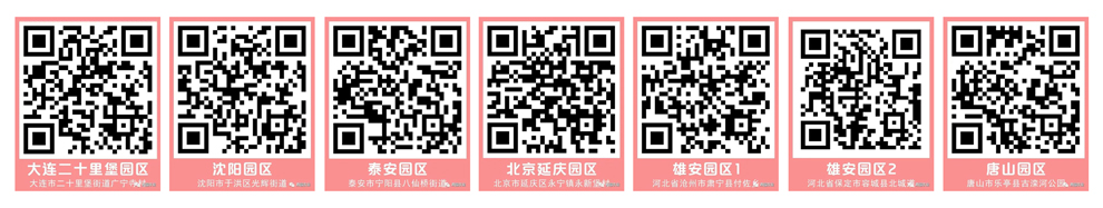 对外开放园区七处:大连二十里堡园区,沈阳园区,泰安园区,北京延庆园区,雄安园区(两处),唐山园区。(长按下列二维码获得园区地址)
