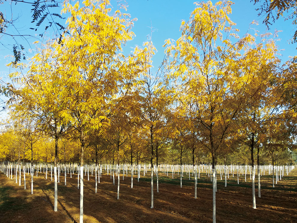 以上照片树种为美国无刺皂荚,是非常好的遮阴树,可作行道树,绿地中心树和城市公共场所遮荫树等用途。对土壤要求不严,抗风能力强。