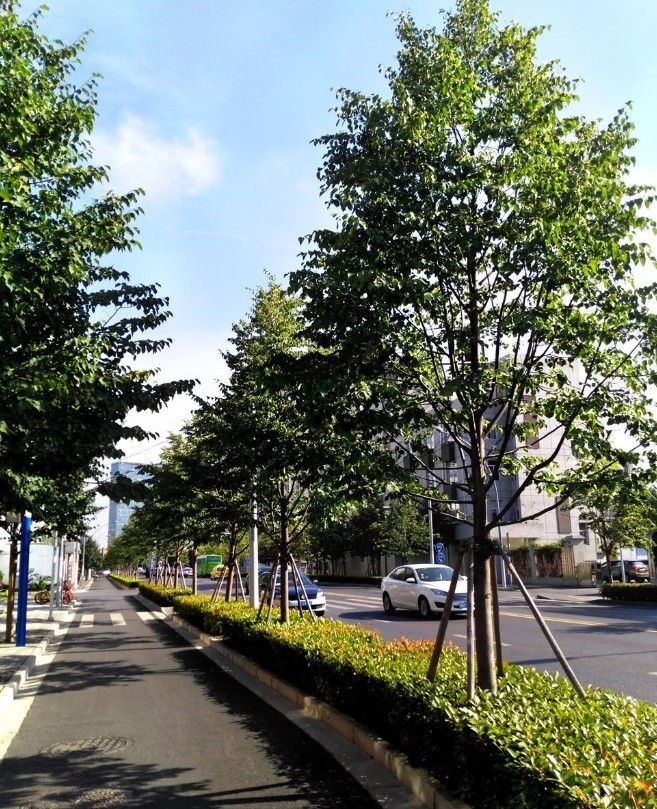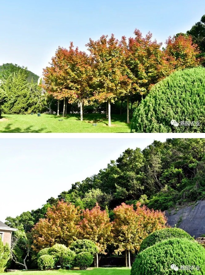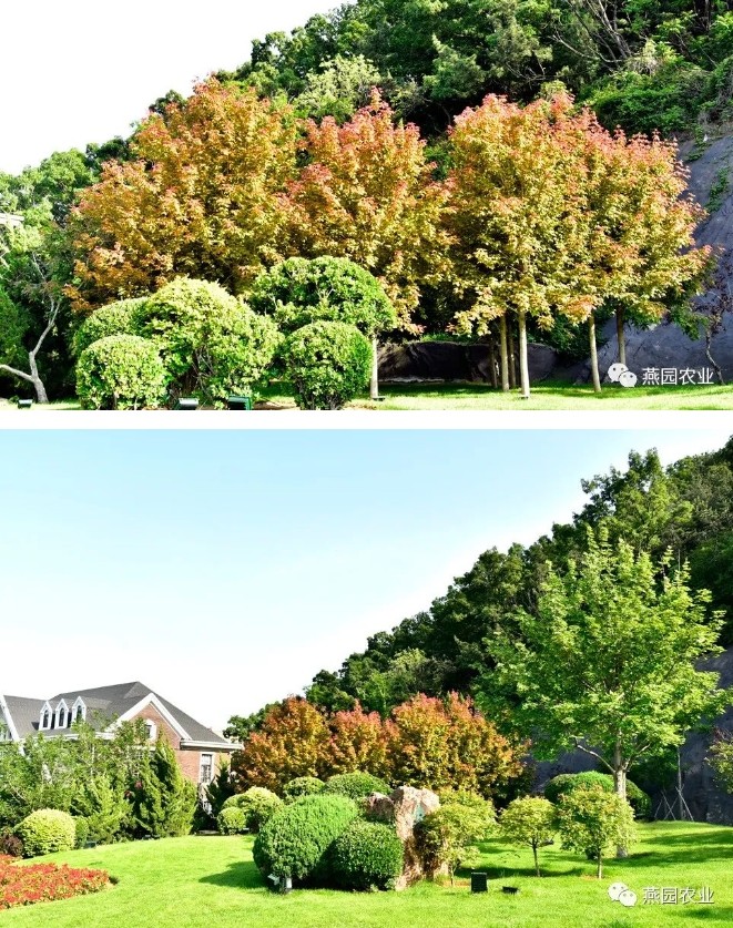 因春夏新生叶片都具有“新叶嫩红色”的特点,除了秋季具有绚丽多彩的景观效果外,夏季新发的嫩红色叶片也形成了其独有的景观观赏价值。伴着旺盛的长势新叶不断发出,整株苗木从内到外由绿至红的渐变,直至树尖处明艳的嫩红色在夏季如同霜打红叶般的存在,使园林景观在夏季中呈现少有的秋色效果。