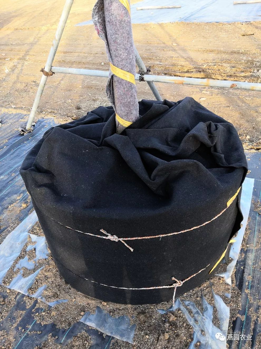 冬季在控根育苗器外部及苗木树干处加裹毡布,为苗木做好保暖防寒工作。
