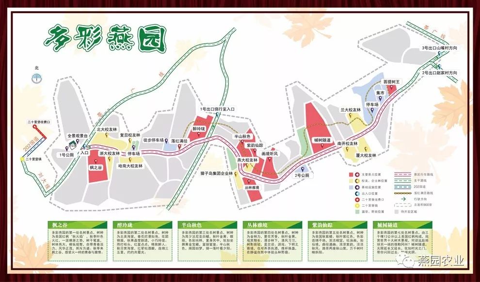 园区内有枫之谷、醉玲珑、半山秋色、丛林雅境、紫韵仙踪和槭树隧道主题景区展示,同时入驻有北京大学、浙江大学、哈尔滨商业大学、复旦大学、燕山大学、兰州大学、南开大学和厦门大学的高校校友林,是一所集自然气息与学府气息完美融合的主题公园。主题公园成立以来为广大考生、家长及校友提供了一个相互交流、增进知识、扩大人脉的平台。