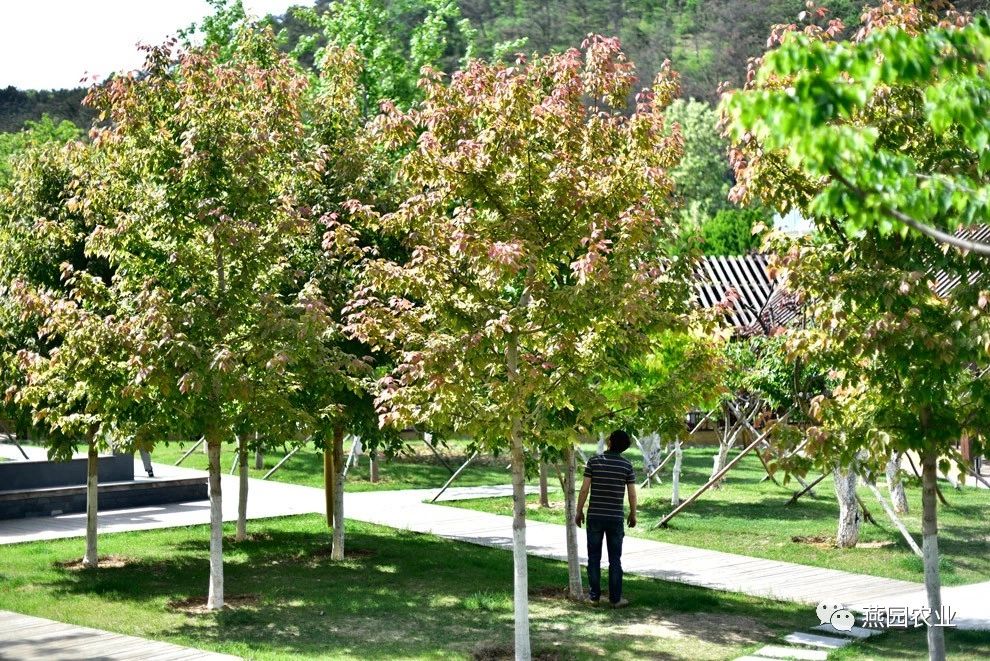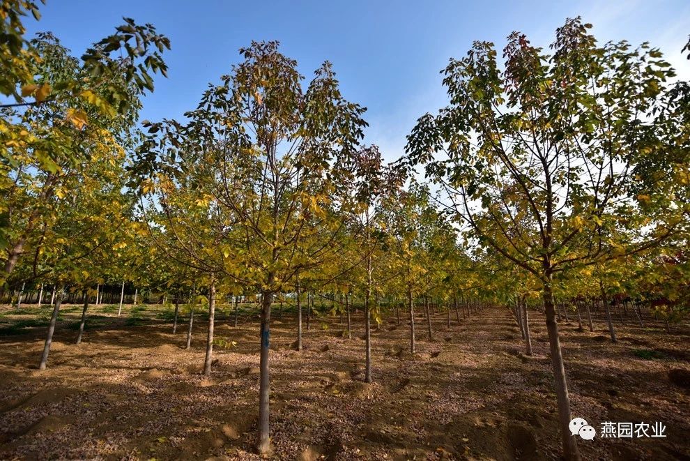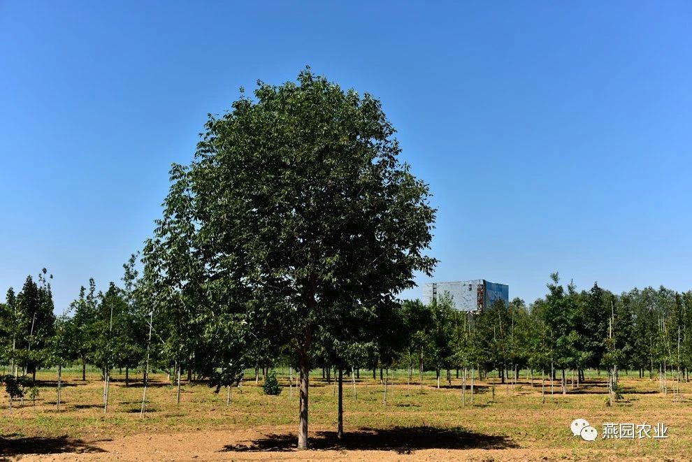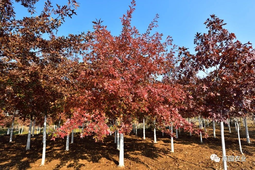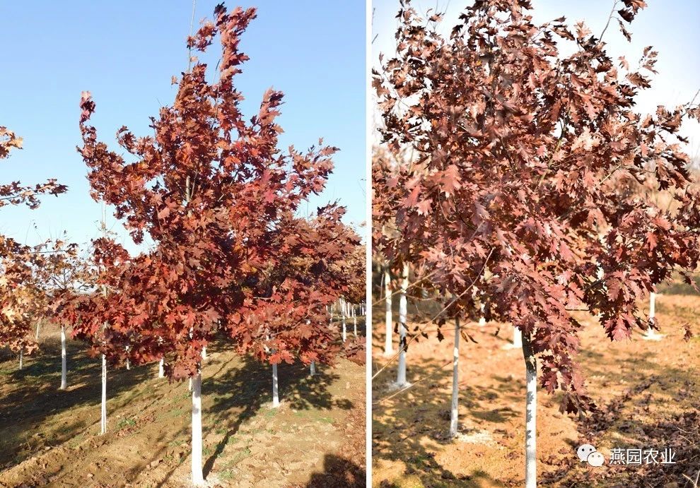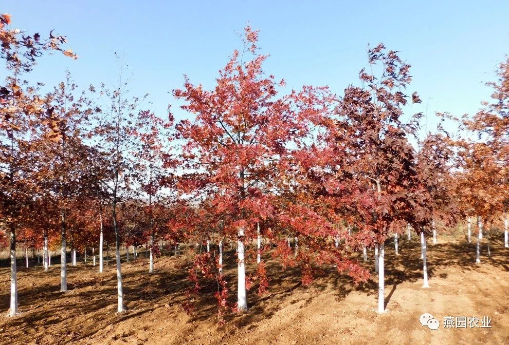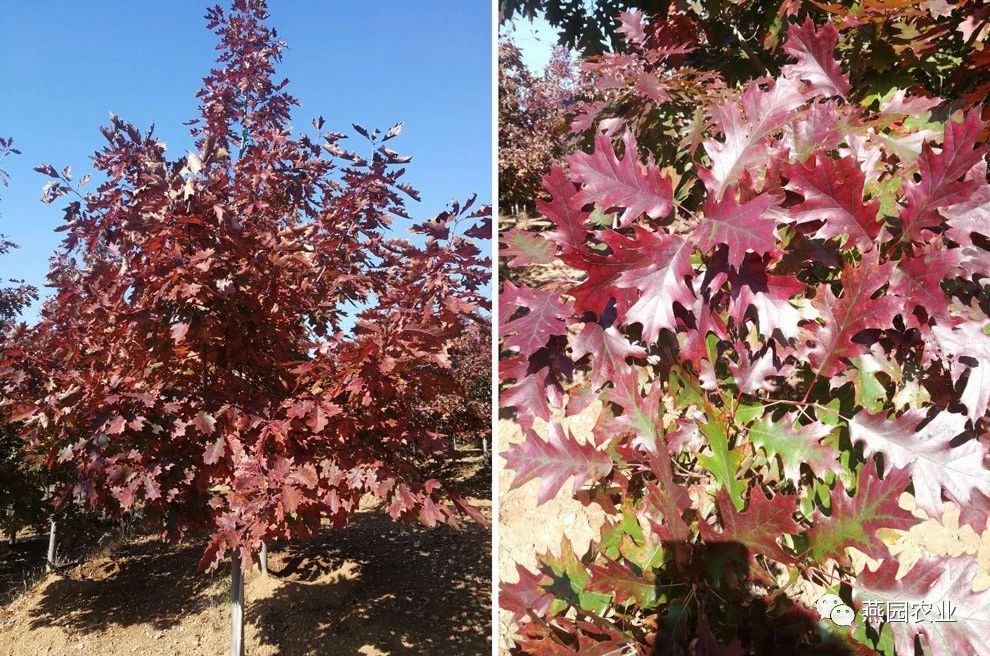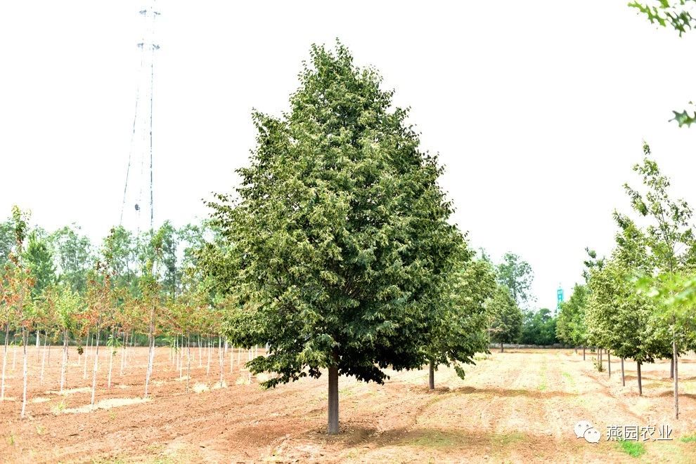 ②树形:树形为圆形,树冠开阔。树皮灰棕色,有浅宽脊,老树树皮变为茶褐色。 ③叶片:叶片较大,新叶粉红色,覆有柔软的白色绒毛,老叶深绿色,光滑,叶上面有光泽,秋叶鲜红,冬叶棕褐色,有时枯而不落。 ④适宜环境:生长速度较快,能适应各种土壤和气候环境,更喜欢肥沃、湿润且排水良好的微酸性沙壤土。树龄可达500年左右。 ⑤适应区域:辽宁南部及以南地区。 ⑥产品规格:Φ8~10CM,H550~600CM,P250~300CM。 ⑦推荐理由:冠大荫浓。