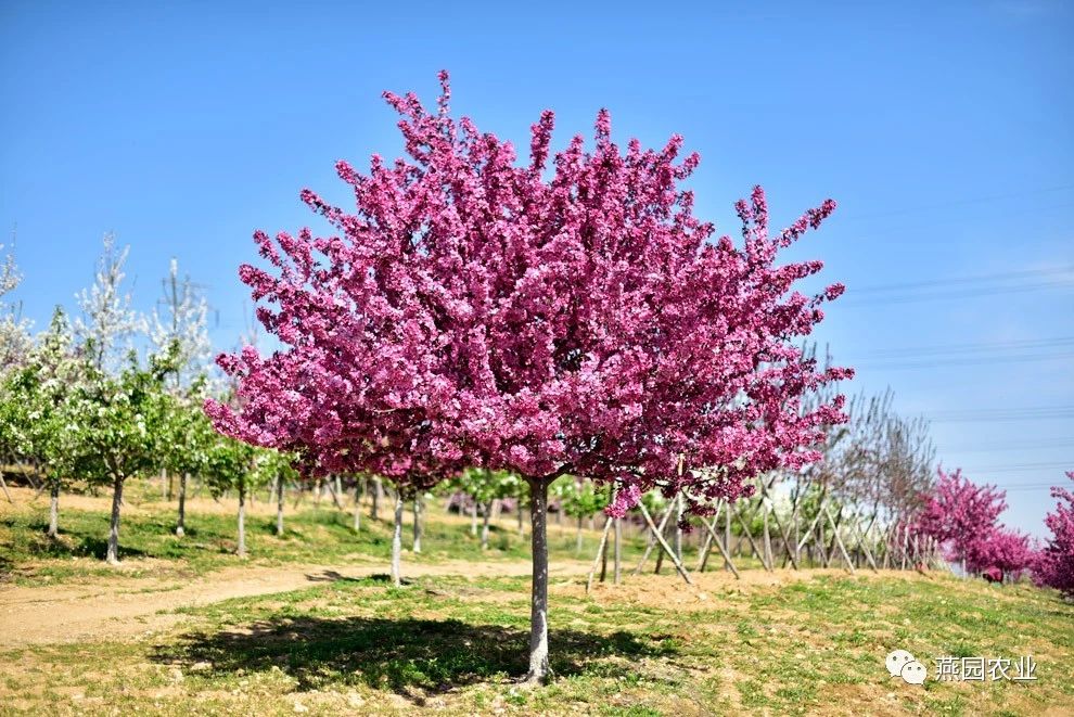 ①拉丁名:Malus 'Indian Magic' ②树形:宽或窄的圆形,直立或垂枝。 ③花朵:有白粉红等色系,单瓣或重瓣两种。 ④果实:有红、黄、紫等色彩,多数品种冬果宿存。 ⑤适宜环境:性喜光,不耐阴,喜温暖湿润环境。对土壤要求不严,微酸或微碱性土壤均可生长,但以土层深厚、疏松、肥沃、排水良好为宜。 ⑥适应区域:辽宁及以南地区。 ⑦产品规格:Φ6~13CM,H200~350CM,P200~350CM。 ⑧推荐理由:观花观果。