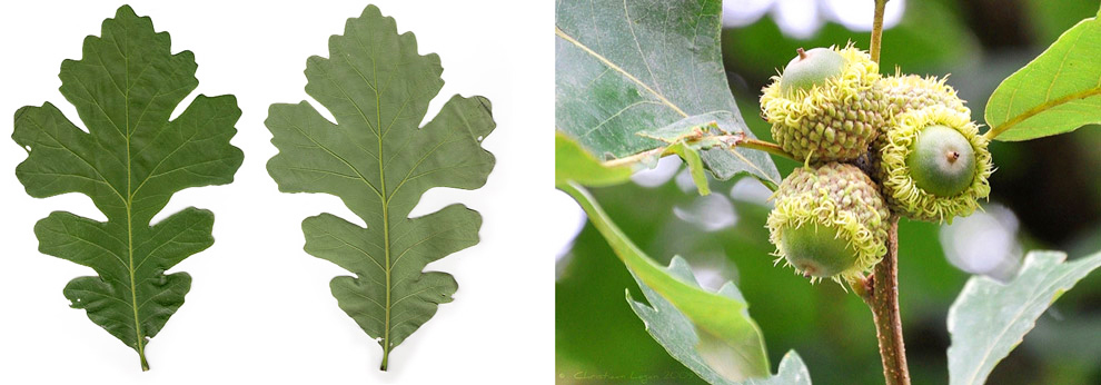 叶片长7-15厘米,宽5-13厘米,叶形变化多样,叶缘有浅裂。最为常见的是,叶基部60%的部分较窄,有深裂,叶顶部40%的部分较宽,有浅裂和大锯齿。花黄绿色,柔荑花序,春季开花。果实为橡子,很大,长2-5厘米,宽2-4厘米,有一个大壳斗包围着坚果的大半部分。
