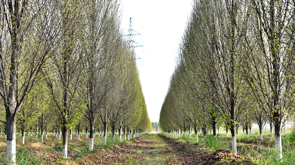 二、按用途批量定干 苗木定干是指将分支点有序提升到符合不同功能需要的高度,标准化生产要求对苗木进行批量定干,一般在花园和公园中应用的苗木定干在1.4-1.5米左右,常规行道树定干在2.0-2.2米左右,有些特殊道路需定干在4米左右。批量定干除了可以使苗木更加整齐、美观外,还可以调整树木的长势,提高移栽成活率,但定干留下的疤痕需要一定时间恢复,一般5-6公分的苗木定干后疤痕愈合较快,因此,在苗木米径达到5-6公分之前,循序渐进的将苗木分支点达到目标高度的做法较为合理。