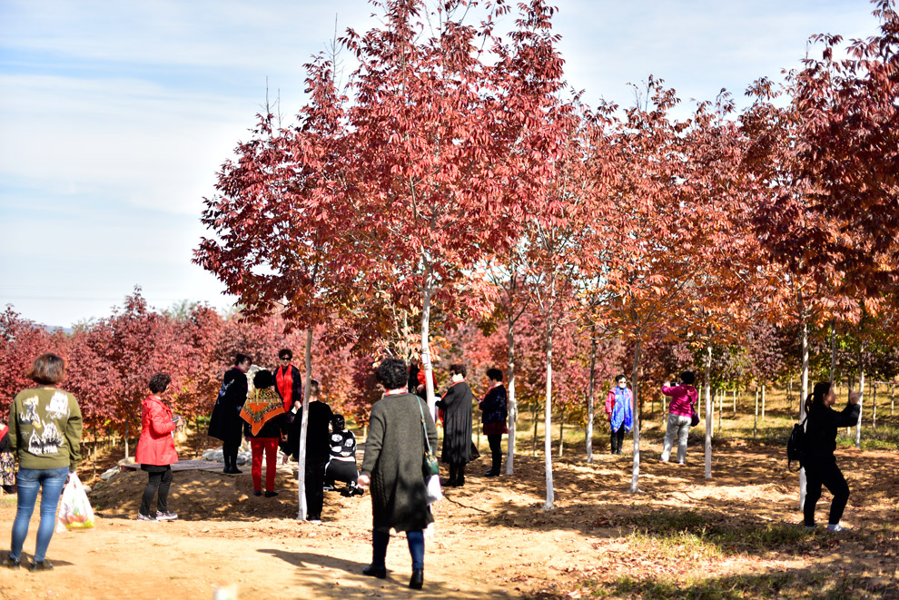 在距离很远的地方就能看到红彤彤的一大片,掩映在绿意中的,便是秋紫蜡树林。